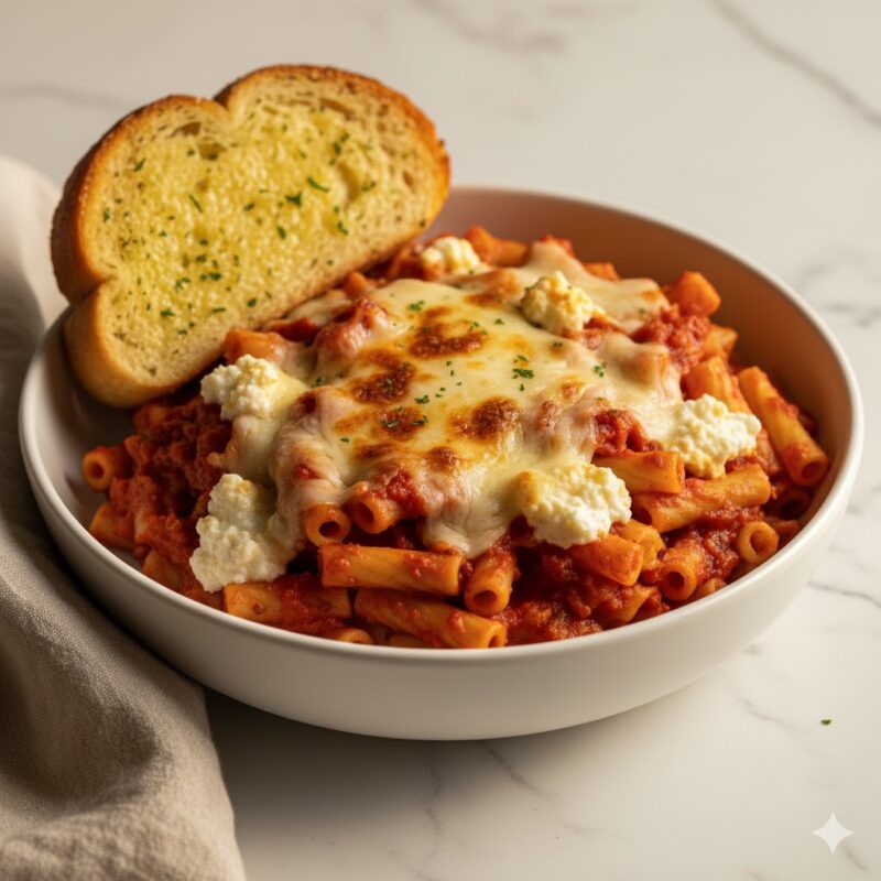 Baked Ziti with Ricotta, Marinara, Mozzarella & Garlic Bread Baked Ziti with Ricotta, Marinara, Mozzarella & Garlic Bread