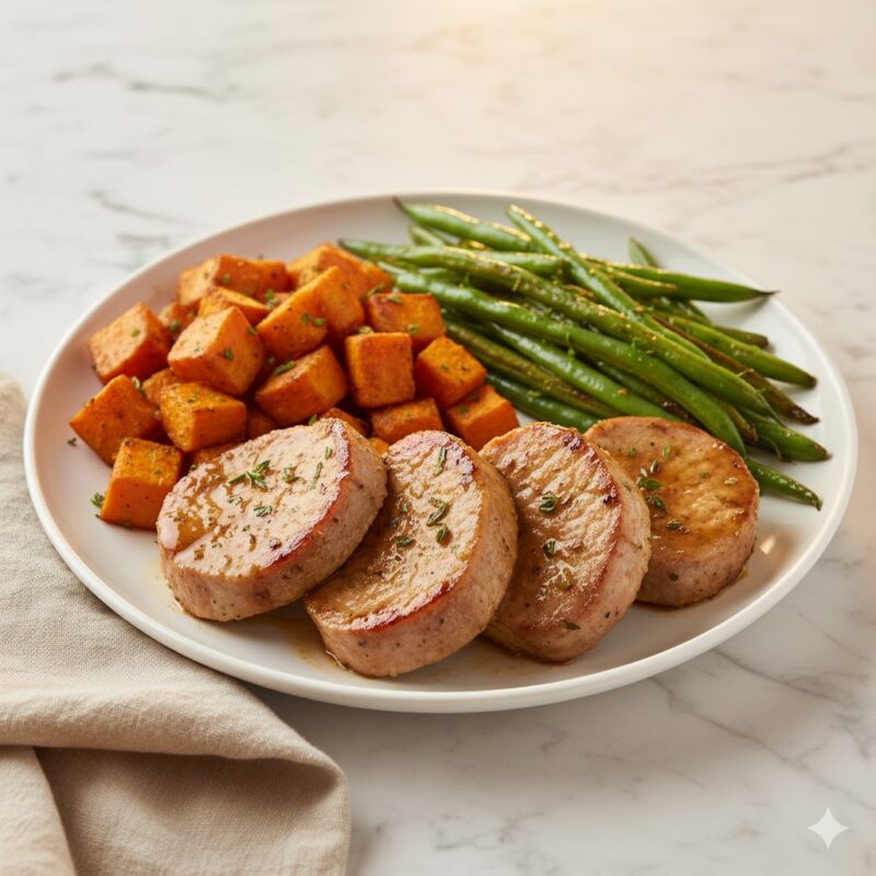 Maple Dijon Pork Tenderloin Medallions w/ Roasted Sweet Potatoes & Green Beans Maple Dijon Pork Tenderloin Medallions w/ Roasted Sweet Potatoes & Green Beans