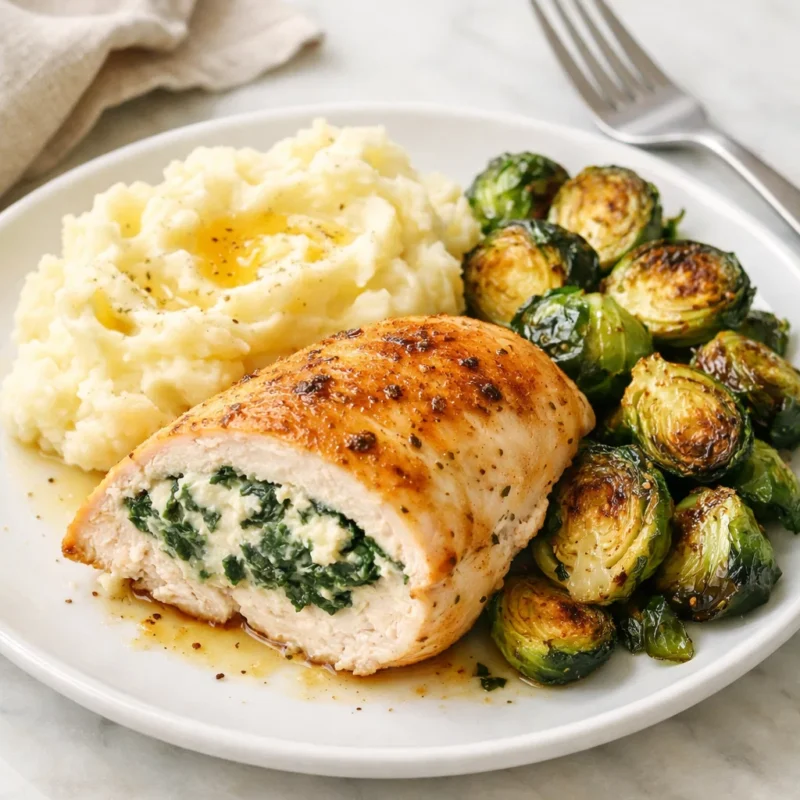 Spinach & Ricotta Stuffed Chicken Breast with Mashed Potatoes & Roasted Brussels Sprouts Spinach & Ricotta Stuffed Chicken Breast with Mashed Potatoes & Roasted Brussels Sprouts