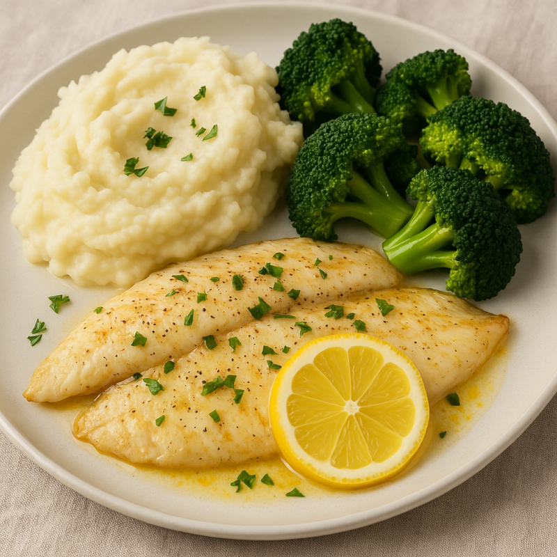 Baked Tilapia with Lemon-Butter Sauce, Mashed Potatoes & Steamed Broccoli Baked Tilapia with Lemon-Butter Sauce, Mashed Potatoes & Steamed Broccoli